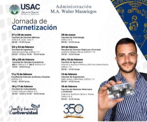 Este 04 de febrero no olvides asistir al Auditorium Olimpia Altuve en horario de 09 a 12 horas para obtener tu carnet de estudiante. El carnet es tu documento de identificación oficial en la USAC.