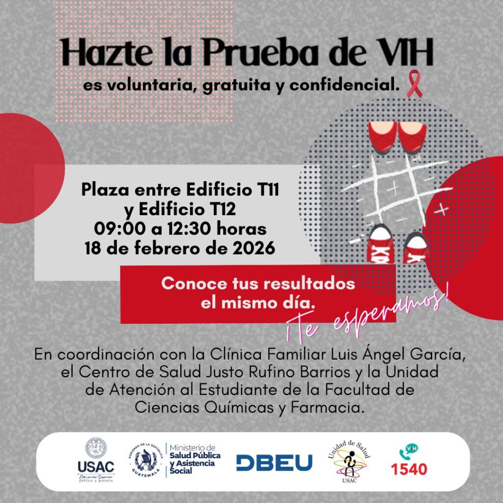 El miércoles 18 de febrero en la plaza entre los edificios T-11 y T-12 en horario de 9:00 a 12:30, se estará realizando de forma gratuita la prueba de tamizaje para VIH, gracias al apoyo de la Clínica Luis Angel García, el Centro de Salud Justo Rufino Barrios y la Unidad de Atención al Estudiante de la Facultad. Los resultados se obtendrán el mismo día y respetando la privacidad del paciente.